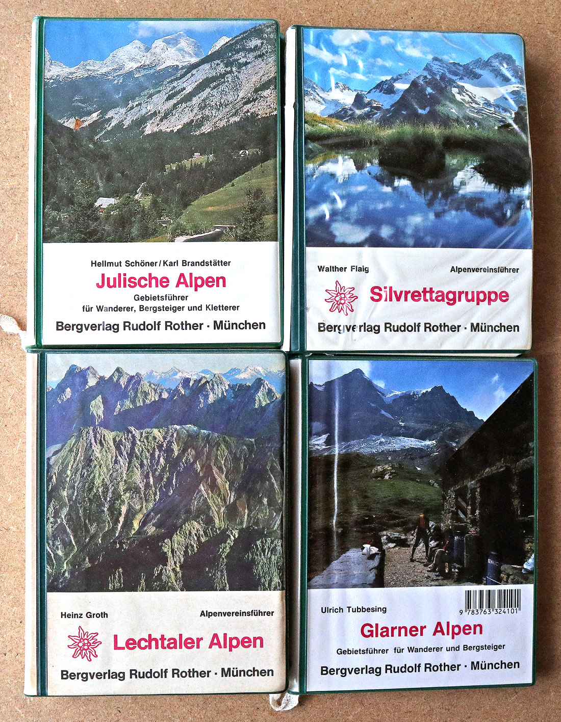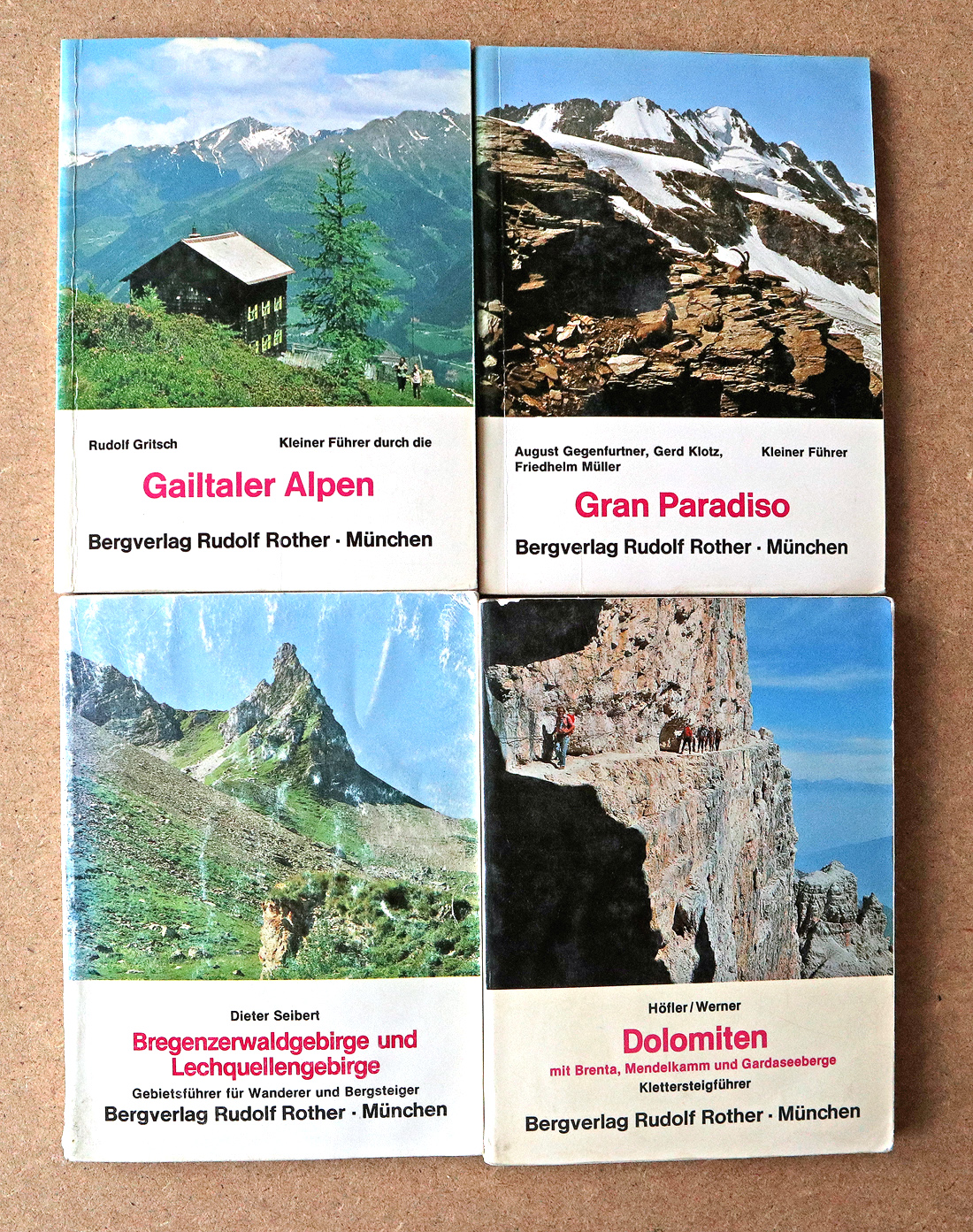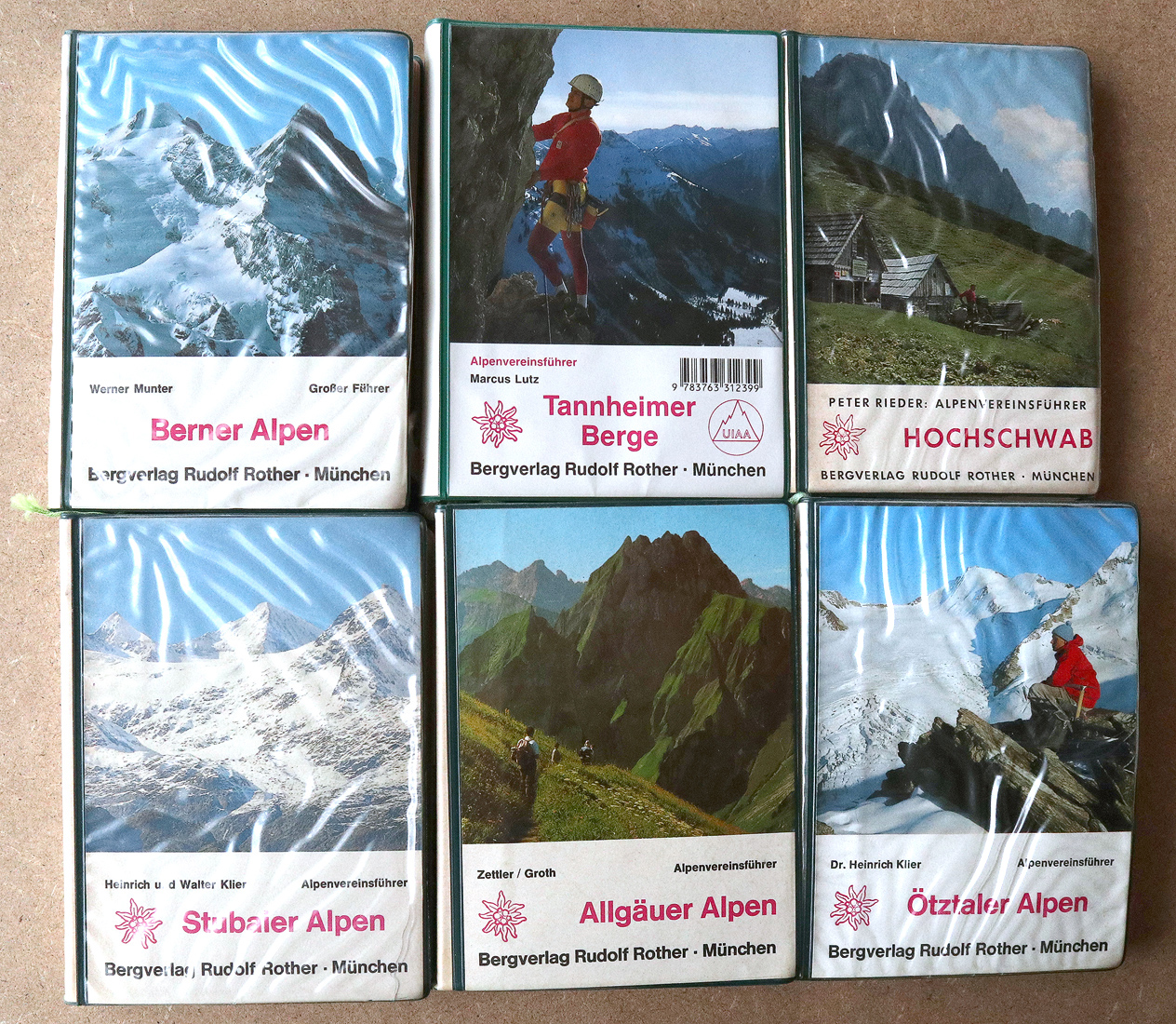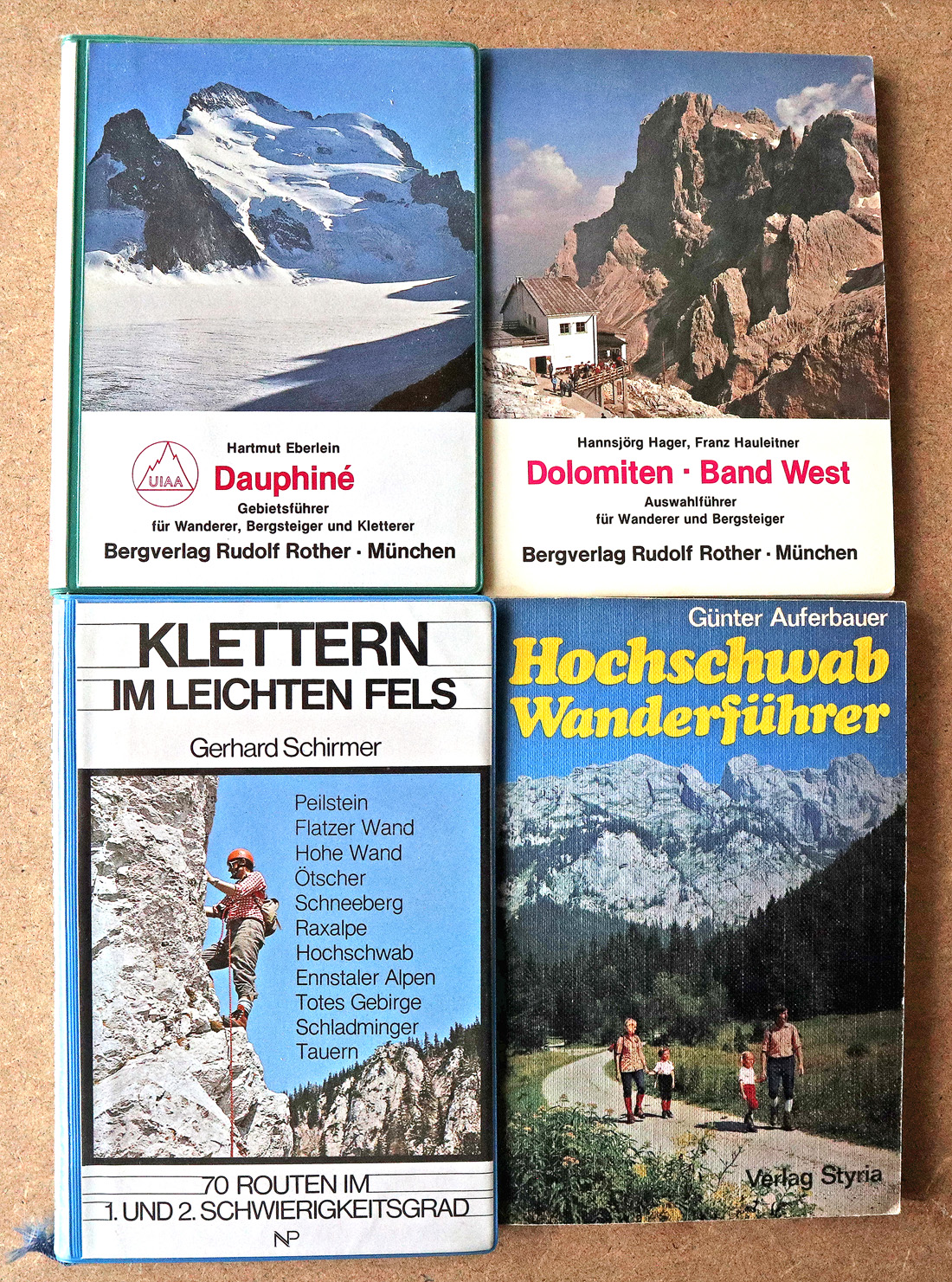 Hier ein Überblick, was sich im Laufe der Jahre an Büchern angesammelt hat. Die Historie unserer Touren spiegelt sich im „Vergilbungsgrad“ dieser Bände wider. Die ersten 20 Jahre waren wir fast ausschliesslich in Österreich, für diese Führerliteratur steht massgeblich der „Rotherverlag“. Von 2000 bis fast 2010 folgte unsere „Schweizer Episode“, begleitet vom noch wenig vergilbten Führerwerk des Schweizer Alpen-Club 😉