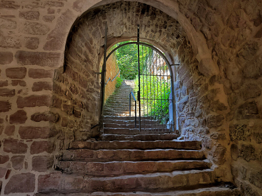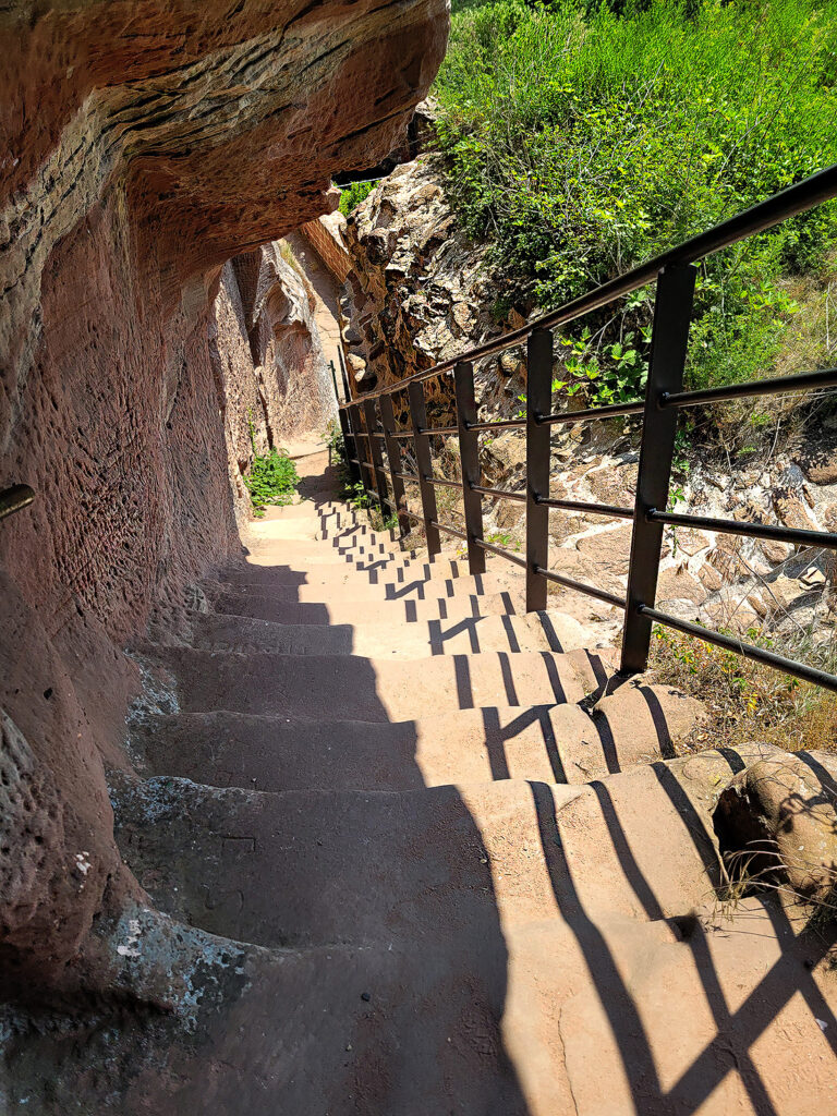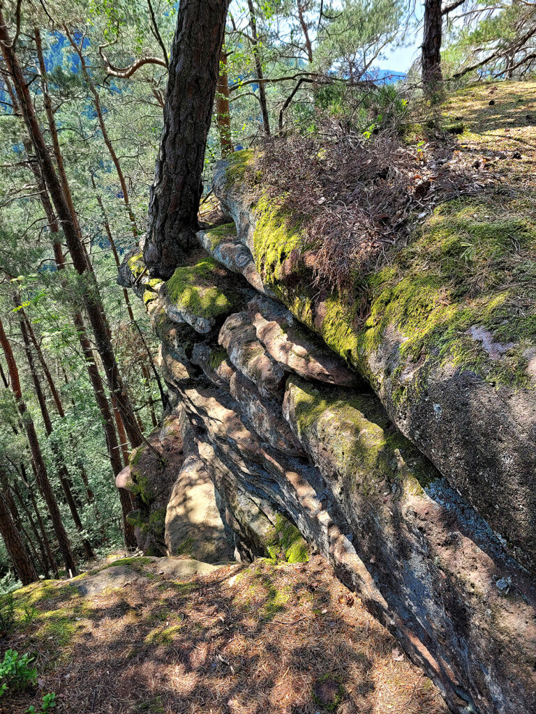Es macht Spass, durch das verwinkelte Gemäuer langsam nach oben zu steigen. Eine steile, luftige Metalltreppe am Ende vermittelt fast schon ein wenig Klettersteig-Gefühl. Nach ausgiebiger Rundschau beschliessen wir unsere kleine Tour mit dem Besuch des Buchkammerfelsens, etwa zwanzig Gehminuten entfernt.