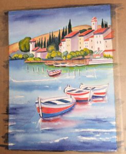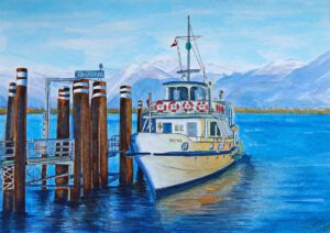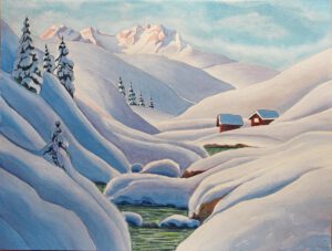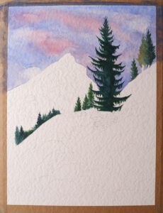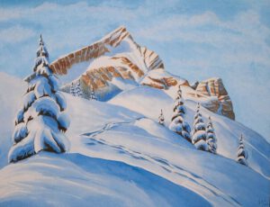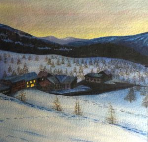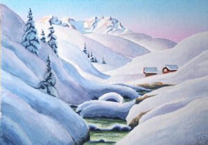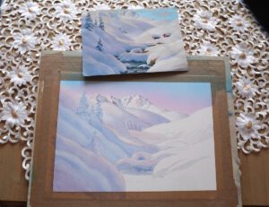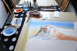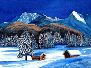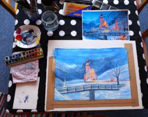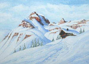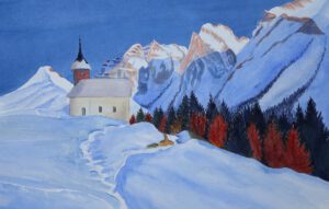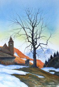 Nach jahrzehntelanger Pause fand ich mit Beginn meiner Rentenzeit zu einem fast vergessenen Hobby zurück: Dem Aquarellieren. Als Lieblingsformat hat sich das Querformat 36 x 25 cm herausgestellt. Alpine Motive sind mir am liebsten. Ich male zumeist nur in der Zeit zwischen Weihnachten und Ostern. Die Arbeitsschritte sind fast immer die gleichen: Motivsuche, dann Erstellung der Pause in Photoshop, Ausdrucken der Pause im Endformat, am Leuchtkasten die Übertragung auf das Aquarellpapier, Nass-Aufziehen des Papieres auf ein Holzbrett – und dann endlich das Malen! Verschiedentlich habe ich das Kombinieren mit der Airbrush-Technik versucht. Aber der Aufwand hierfür ist mir doch zu groß.