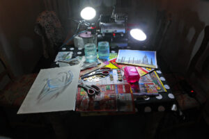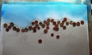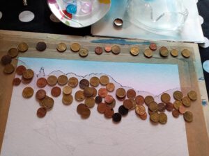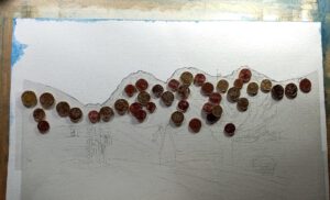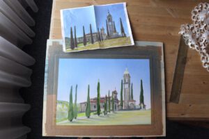 Der Prozess beginnt mit der Auswahl des Motivs, danach folgt das Erstellen einer Pause davon. Zur Übertragung auf den Aquarellkarton nutze ich mein altes Just-Diatablett. Das etwas kniffelige Aufziehen des nassen Kartons auf ein Holzbrett ist ein Muss. Erst dann kann ich dem „Rausch der Farbe“ frönen…